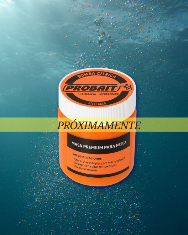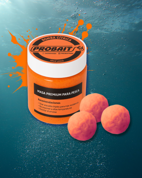 ProBait Bomba Cítrica es una masa de pesca especialmente diseñada para pacú, con textura firme y manejable , similar a Maíz y Vainilla, que permite formar la masa en un “coquito” sobre el anzuelo. Su color naranja intenso y aroma cítrico potente incrementan la atracción bajo el agua, mientras que su resistencia asegura un encarne duradero y eficiente en diversas modalidades de pesca.